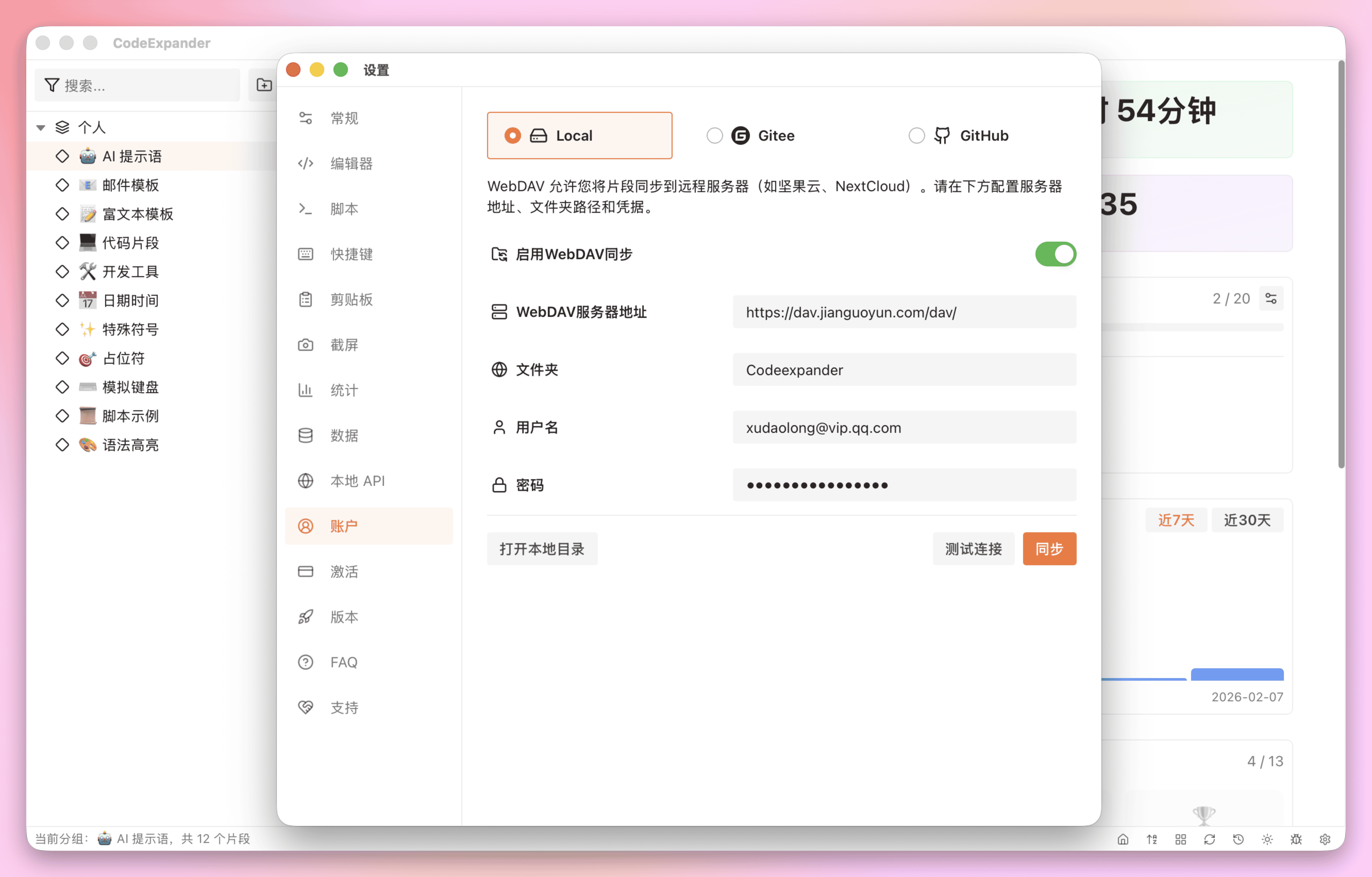片段、截图、剪贴板内容都在本机。同步用你自己的 GitHub Gist、Gitee Gist 或 WebDAV,我们拿不到你的数据。可完全离线使用;支持导入/导出 JSON、CSV,便于迁移与备份。